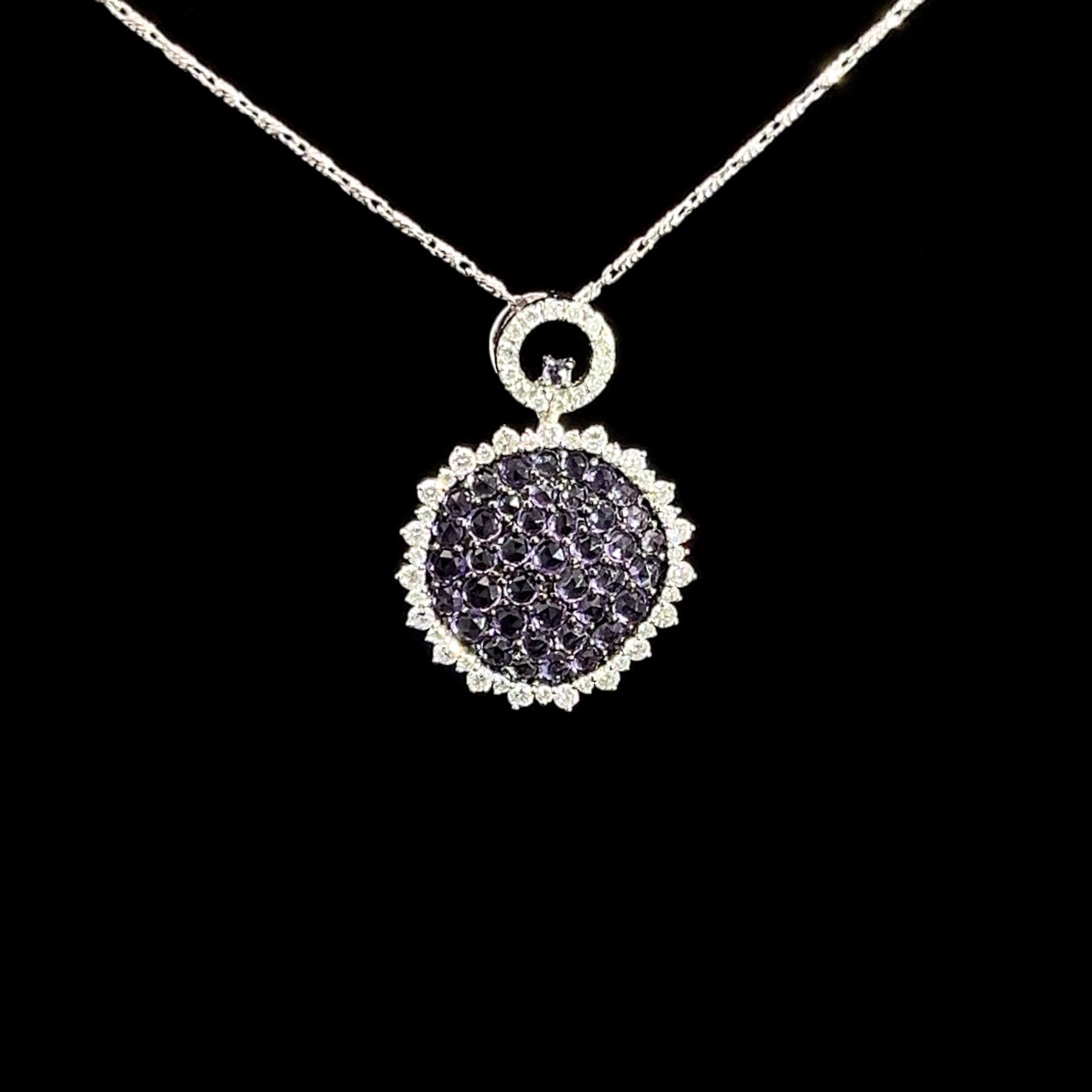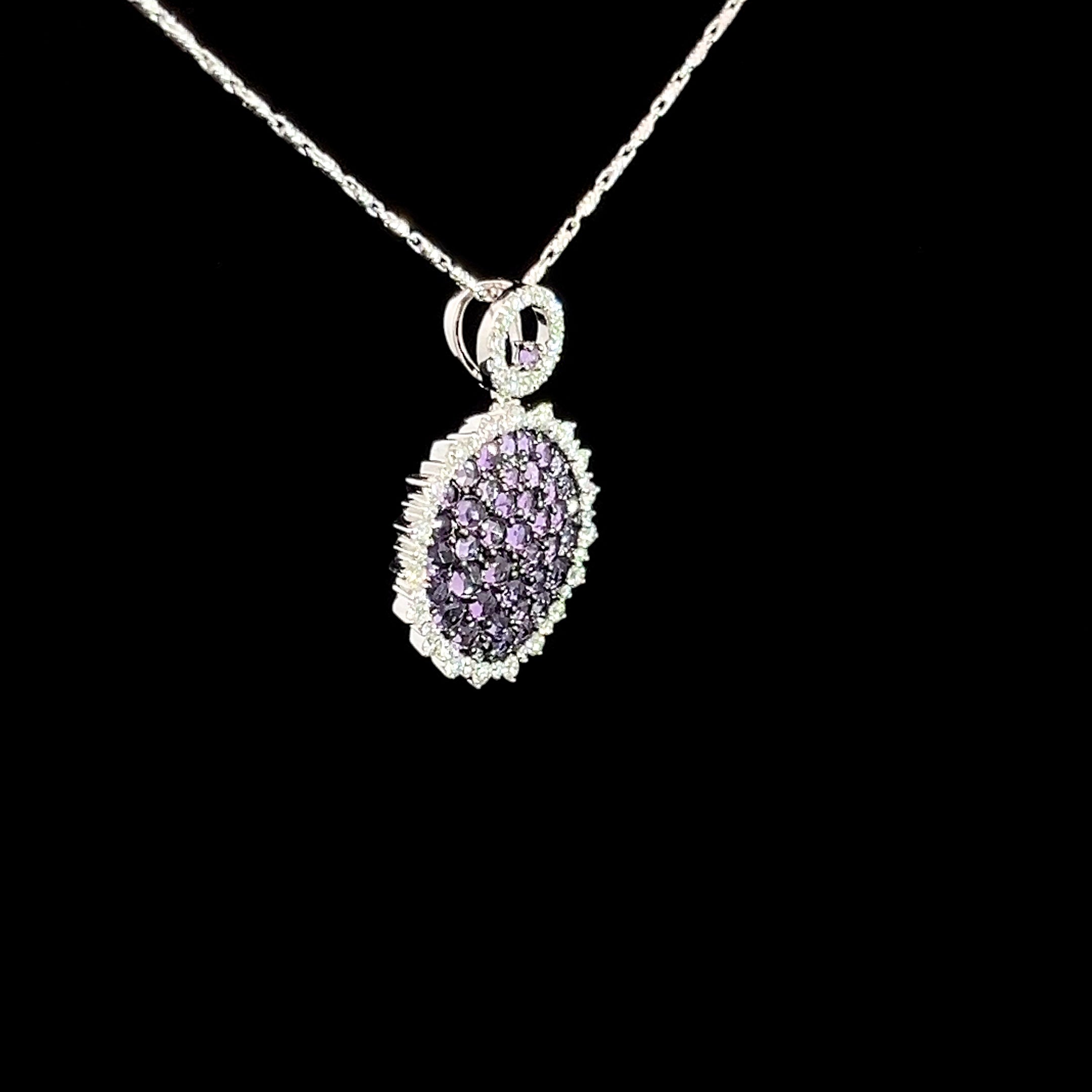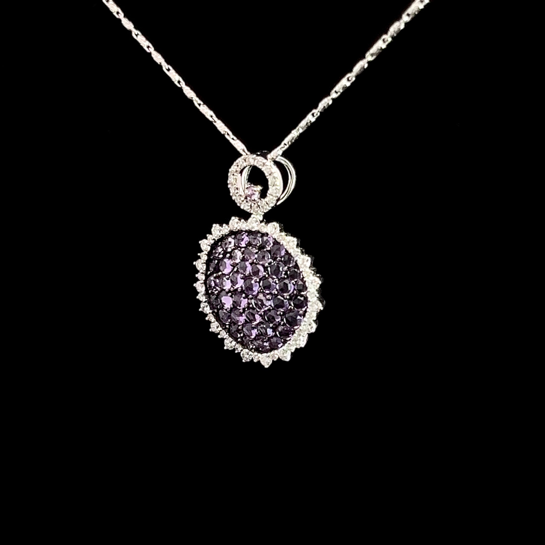Add a splash of sparkle and color with this playful Diamond Amethyst Pendant crafted in white gold. The vibrant purple amethyst pairs perfectly with shimmering diamonds, creating a fun and eye-catching accessory. Its sleek white gold setting adds a modern touch, making it a delightful piece to brighten up any outfit or occasion.
