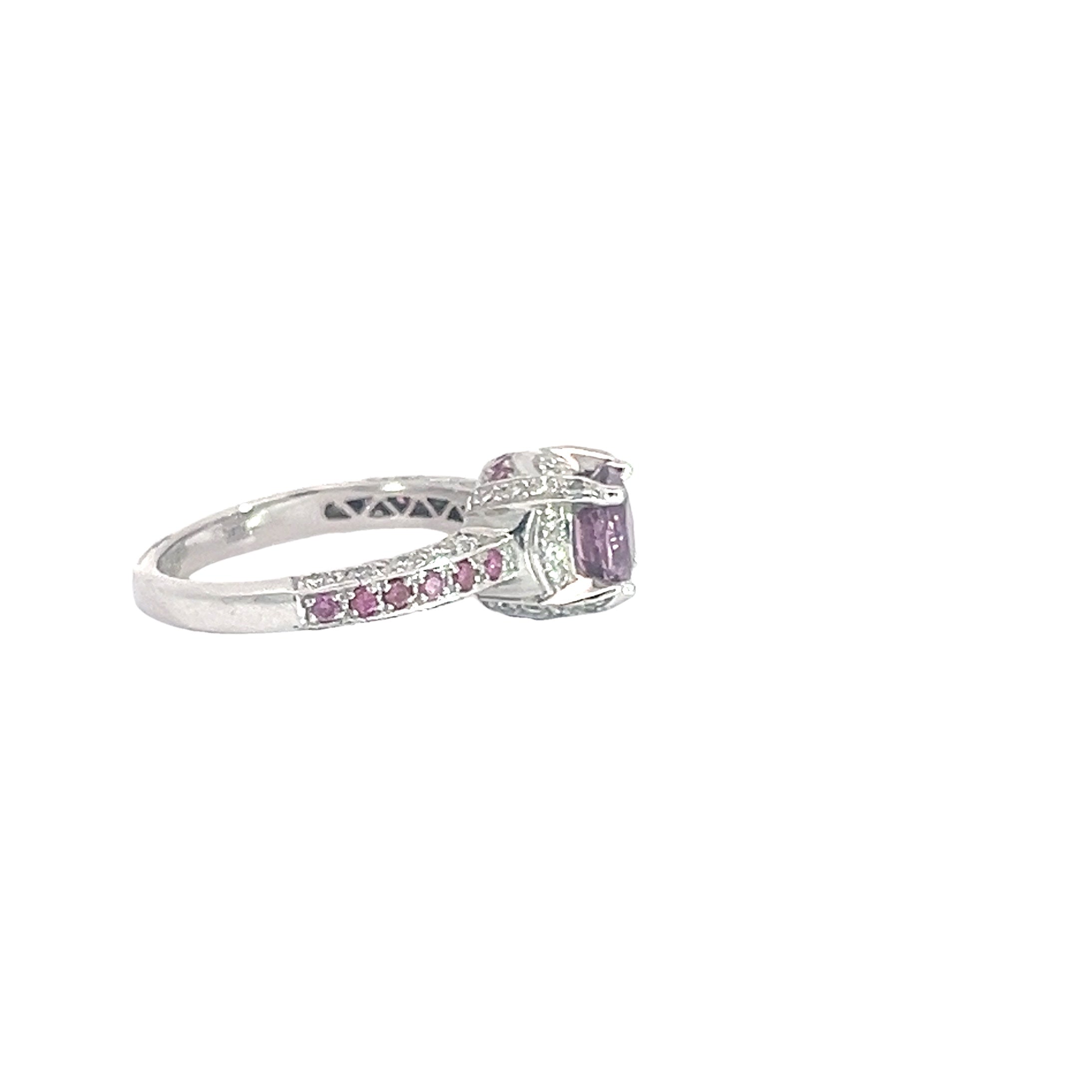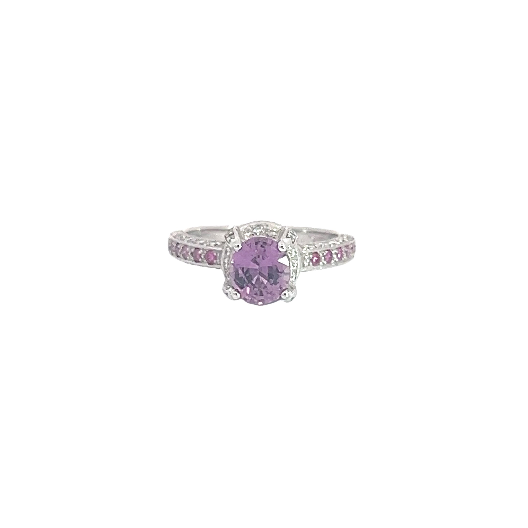 Make a bold statement with this Pink/Purple Sapphire Ring, featuring vibrant sapphire accents that catch the light with every movement. Set on a sleek white gold band, this daring piece combines elegance with a pop of unexpected color, perfect for those who love to stand out.