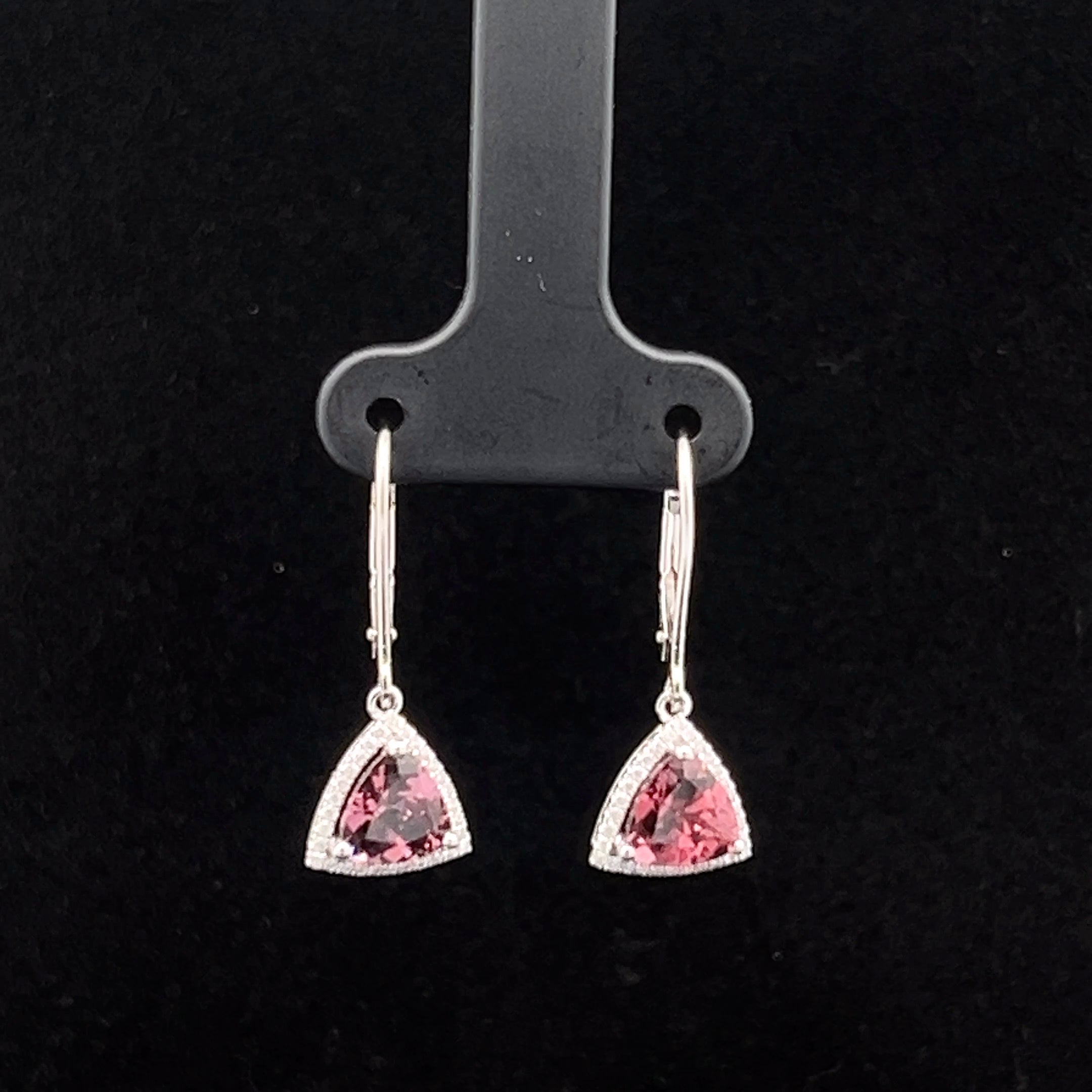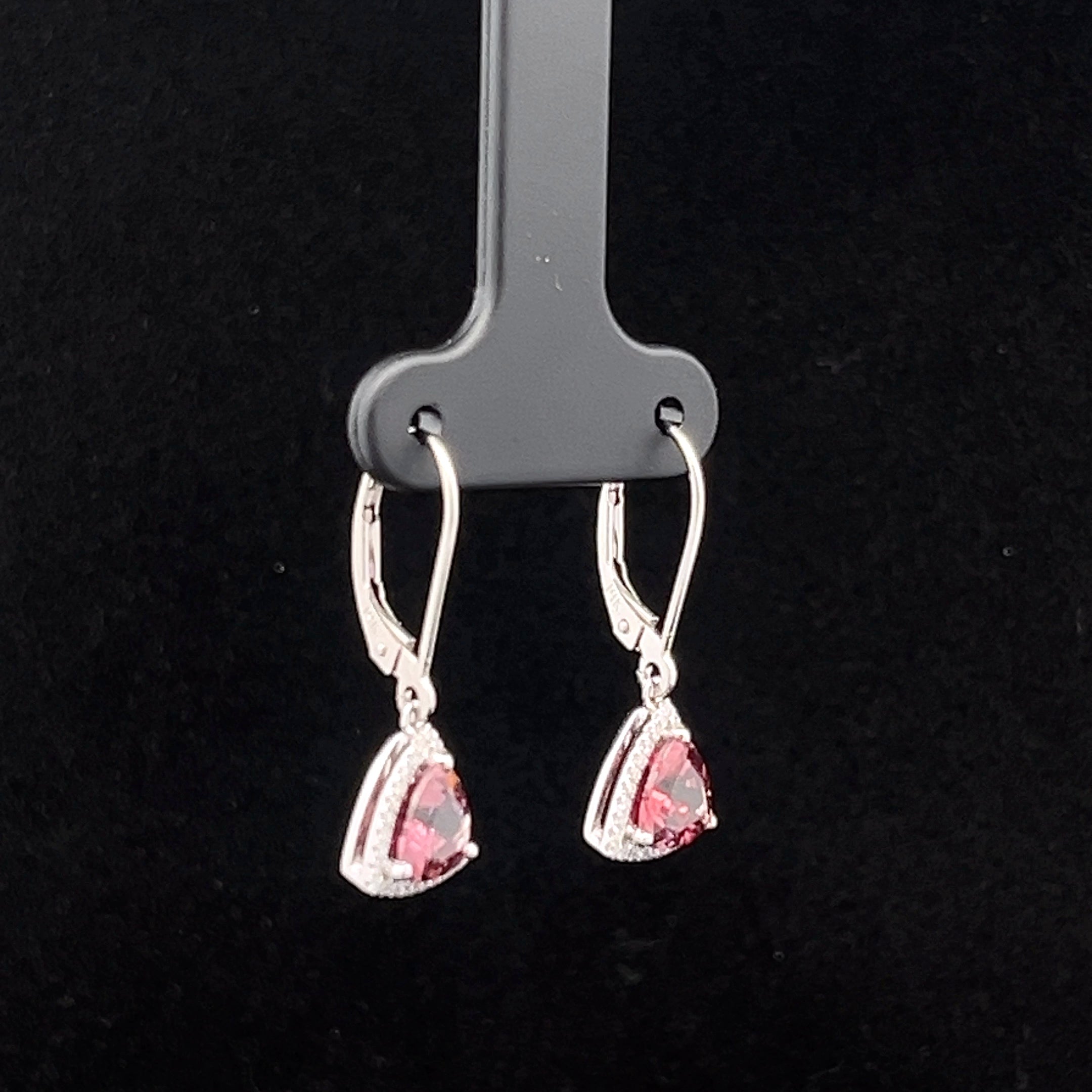 These Pink Tourmaline Trillion Earrings feature vibrant pink tourmaline stones set in a secure 14k white gold leverback design, accented with sparkling diamonds. Combining elegance and comfort, they provide a secure fit while adding a touch of brilliance to your look. Perfect for enhancing everyday style or special moments with a graceful, supportive sparkle.