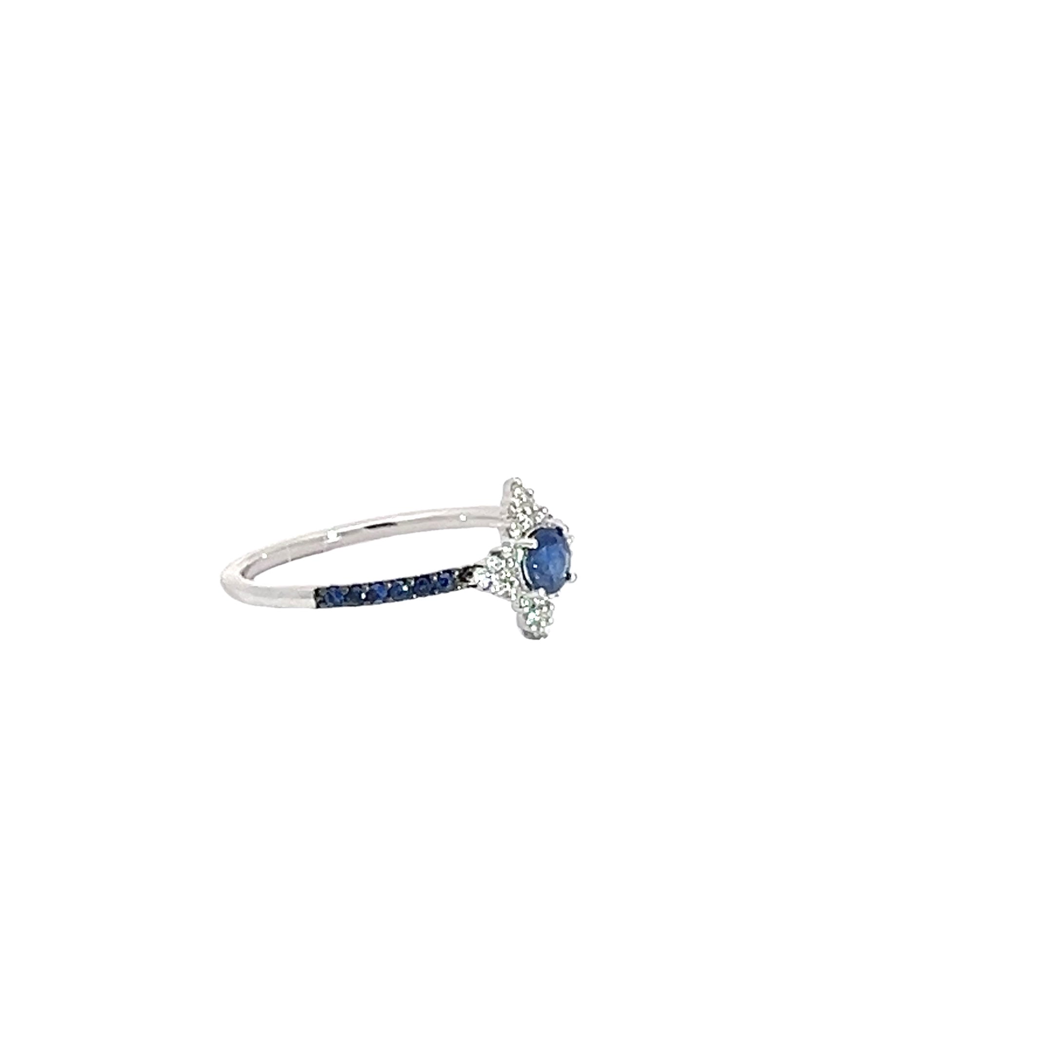 Add a splash of sparkle with this dainty sapphire ring, featuring playful blue sapphire accents and shimmering diamonds set in sleek white gold. Perfect for adding a fun, elegant touch to any outfit!