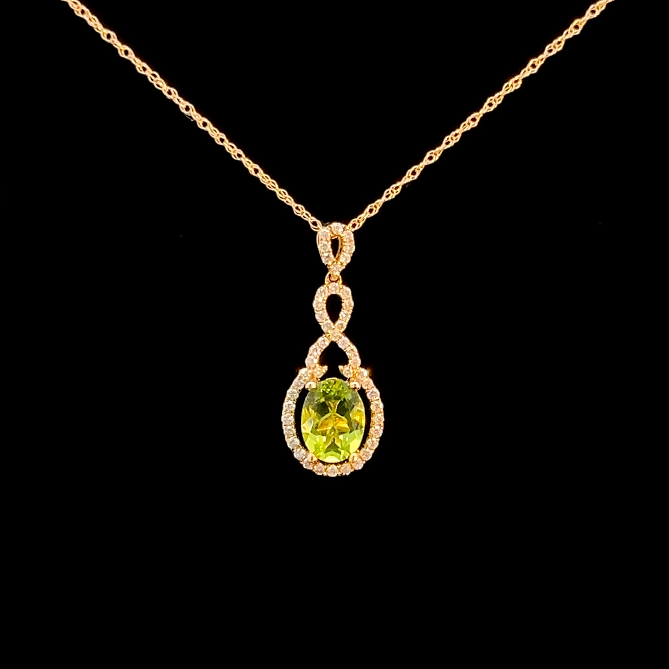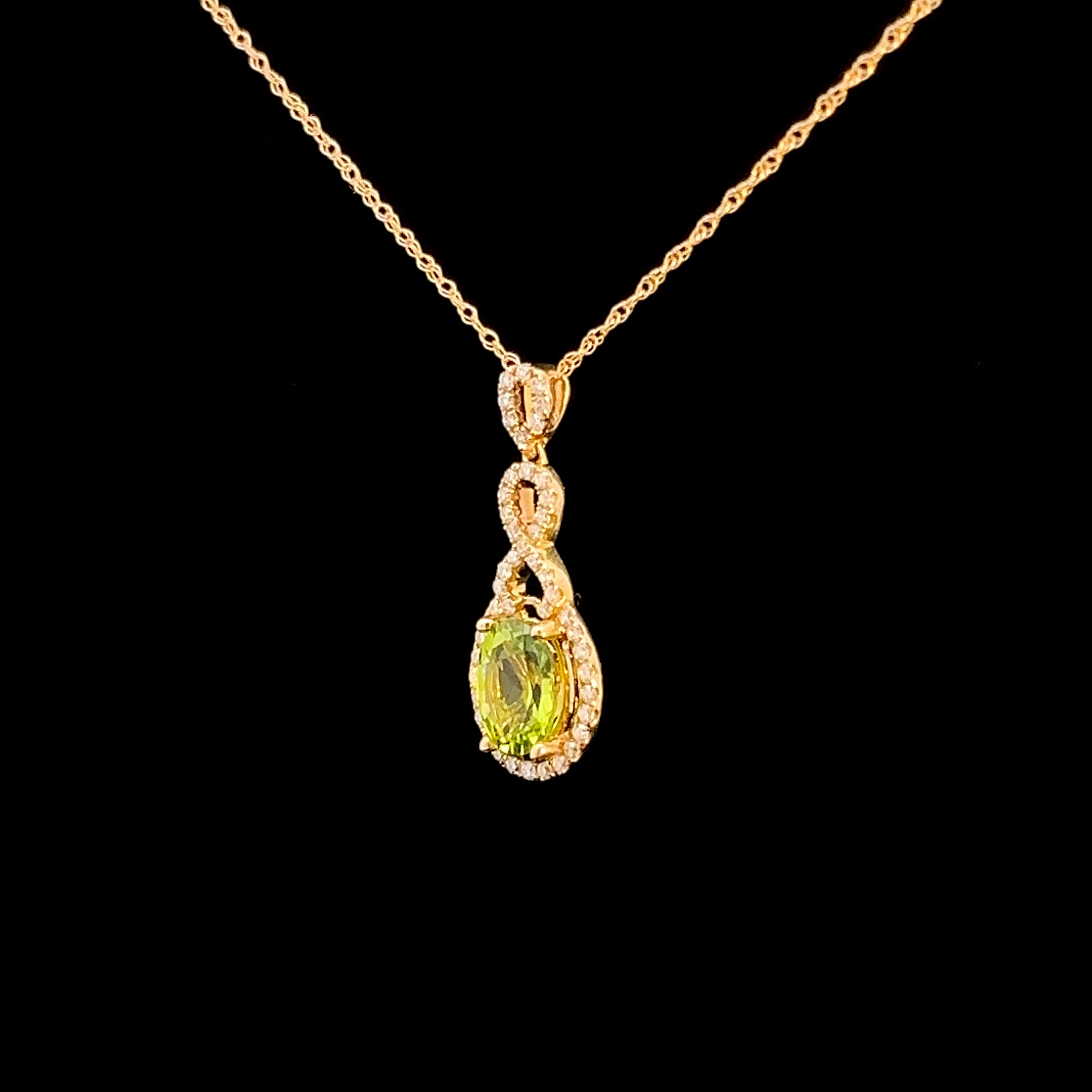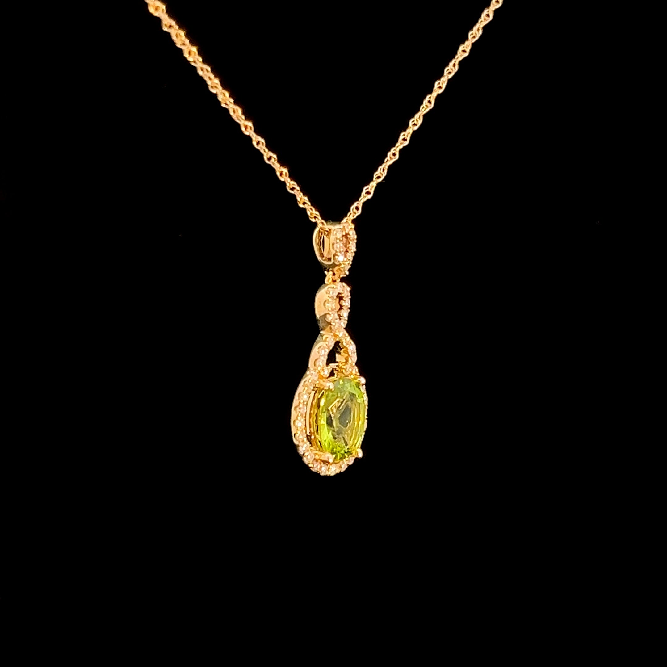 This exquisite gold pendant necklace features a stunning peridot at its center, surrounded by natural diamonds. The intricate design and luxurious materials make it a perfect accessory for any special occasion. The necklace is set in 14k yellow gold with an 18" chain.
