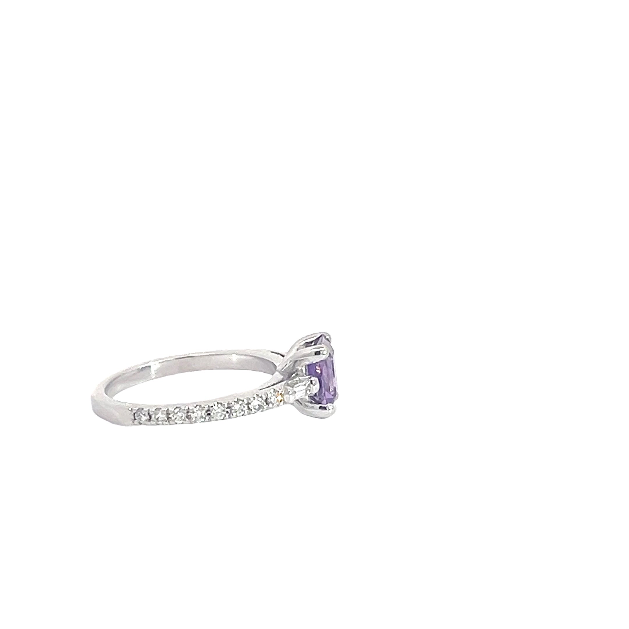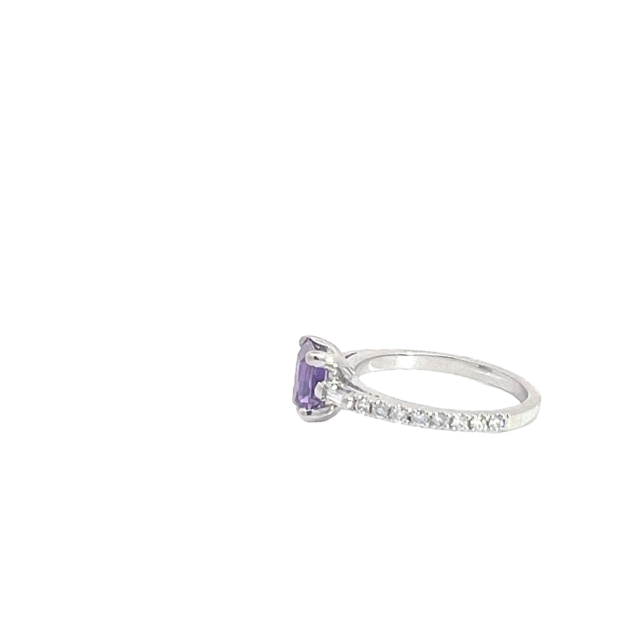 This stunning white gold ring features a captivating "Color-Change Sapphire" that showcases two different colors depending on it's light source. The dual-colored gem is beautifully complemented by the sparkling diamonds on either side, creating a piece that exudes elegance and sophistication.