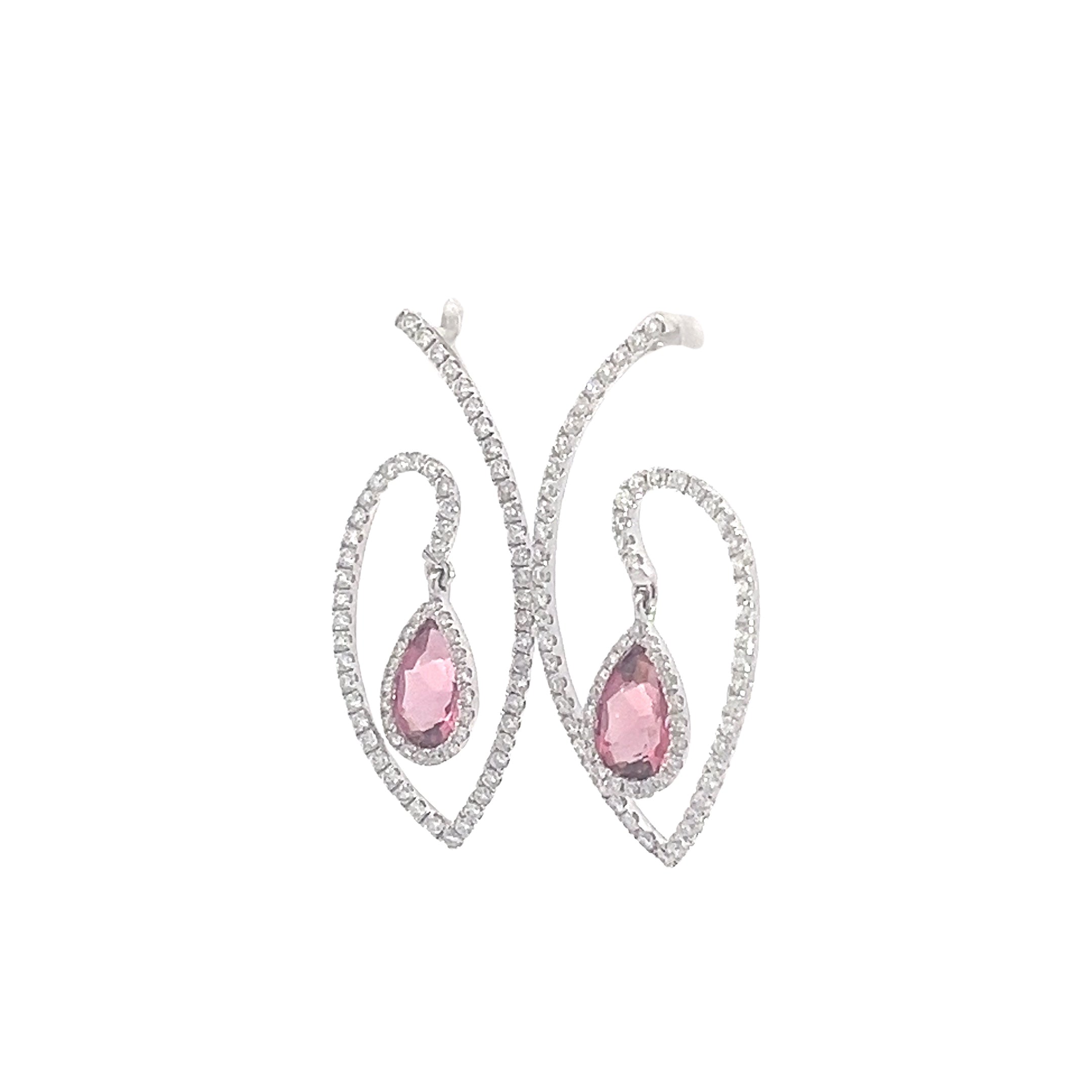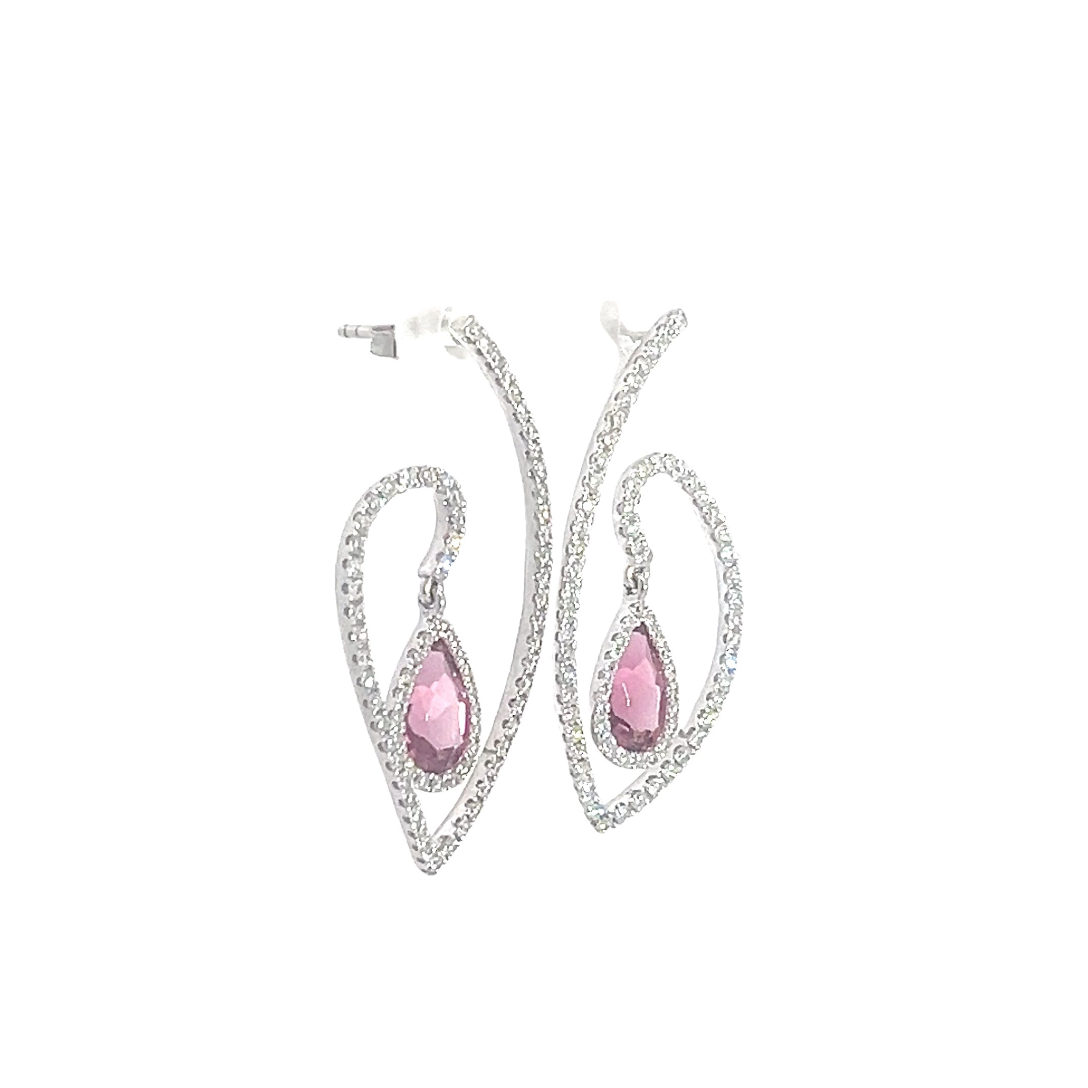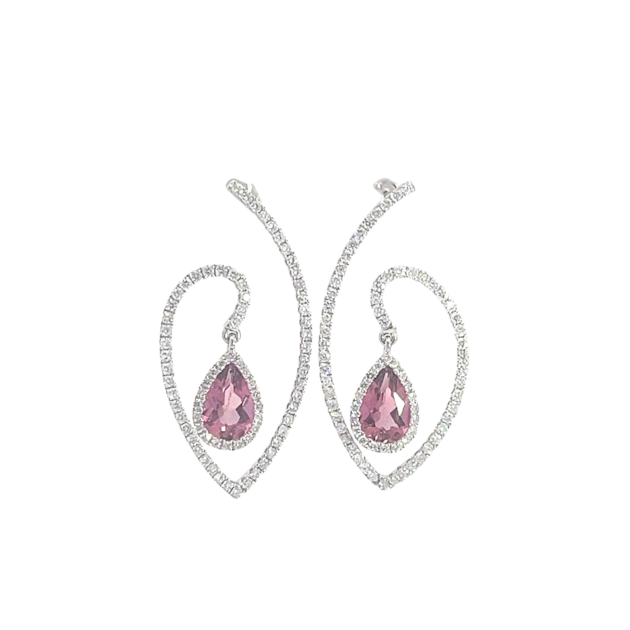These exquisite pink Rubellite tourmaline teardrop earrings feature dazzling gemstones surrounded by a halo of sparkling diamonds. The unique loop design adds an element of sophistication and glamour, making them the perfect accessory for any special occasion.
