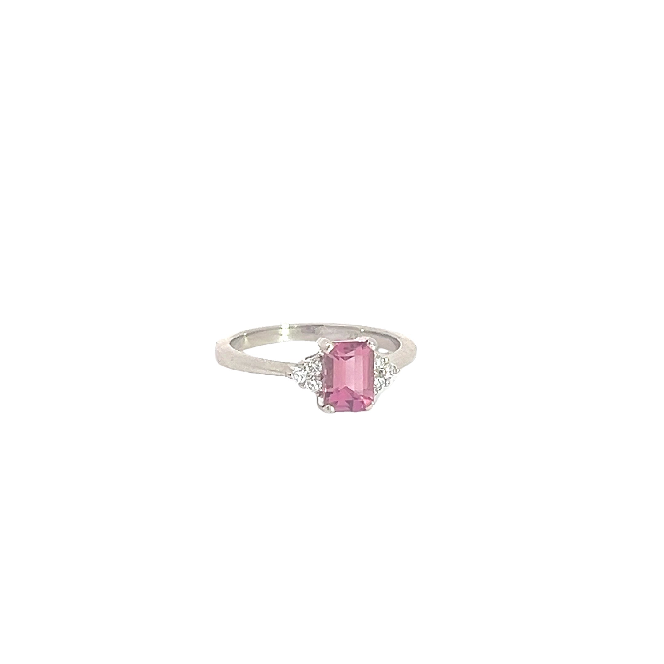 This exquisite ring features a stunning 1.10ct pink tourmaline at its center, set in a sleek white gold band. The sparkle of the gem is beautifully accentuated by delicate white diamonds (.15ctw) on either side, making it a perfect choice for those who appreciate timeless elegance.
