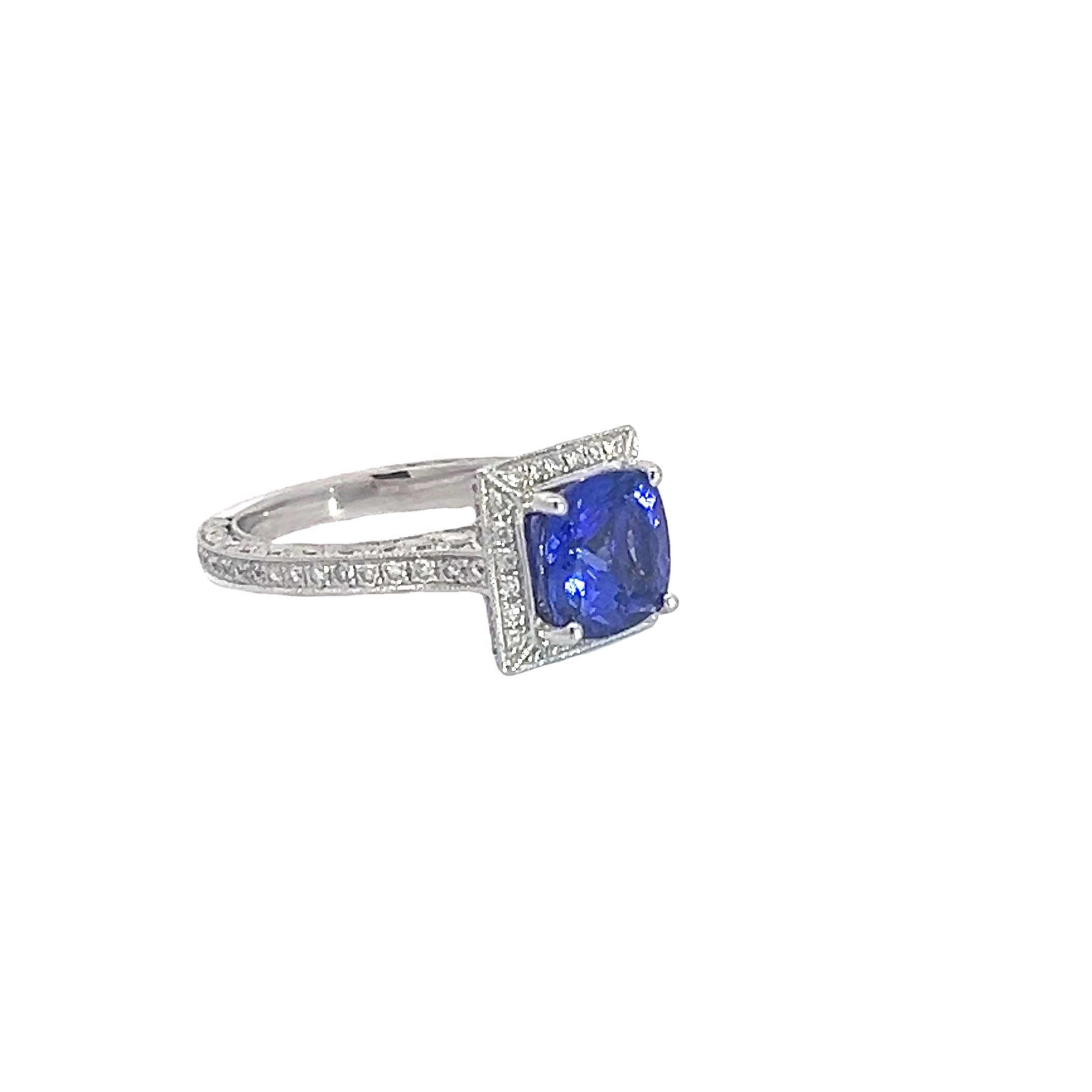 This stunning ring features a captivating cushion cut Tanzanite, set in a delicate band adorned with sparkling diamonds. The deep blue hue of the Tanzanite is beautifully complemented by the natural diamonds, making this piece an exquisite addition to any jewelry collection. Ring: 14k white gold, size 6.5